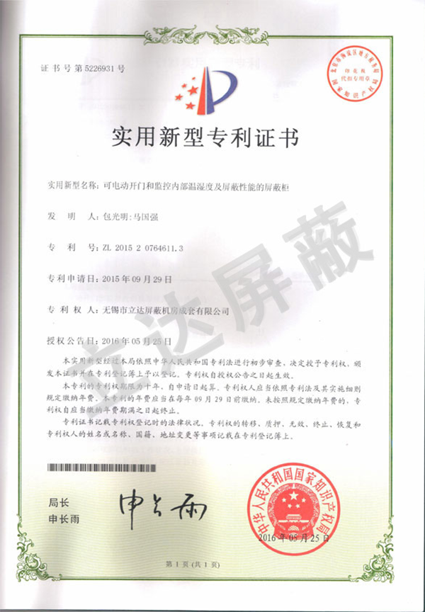 資質證書 專業的電磁屏蔽機房的研發、設計與制造商